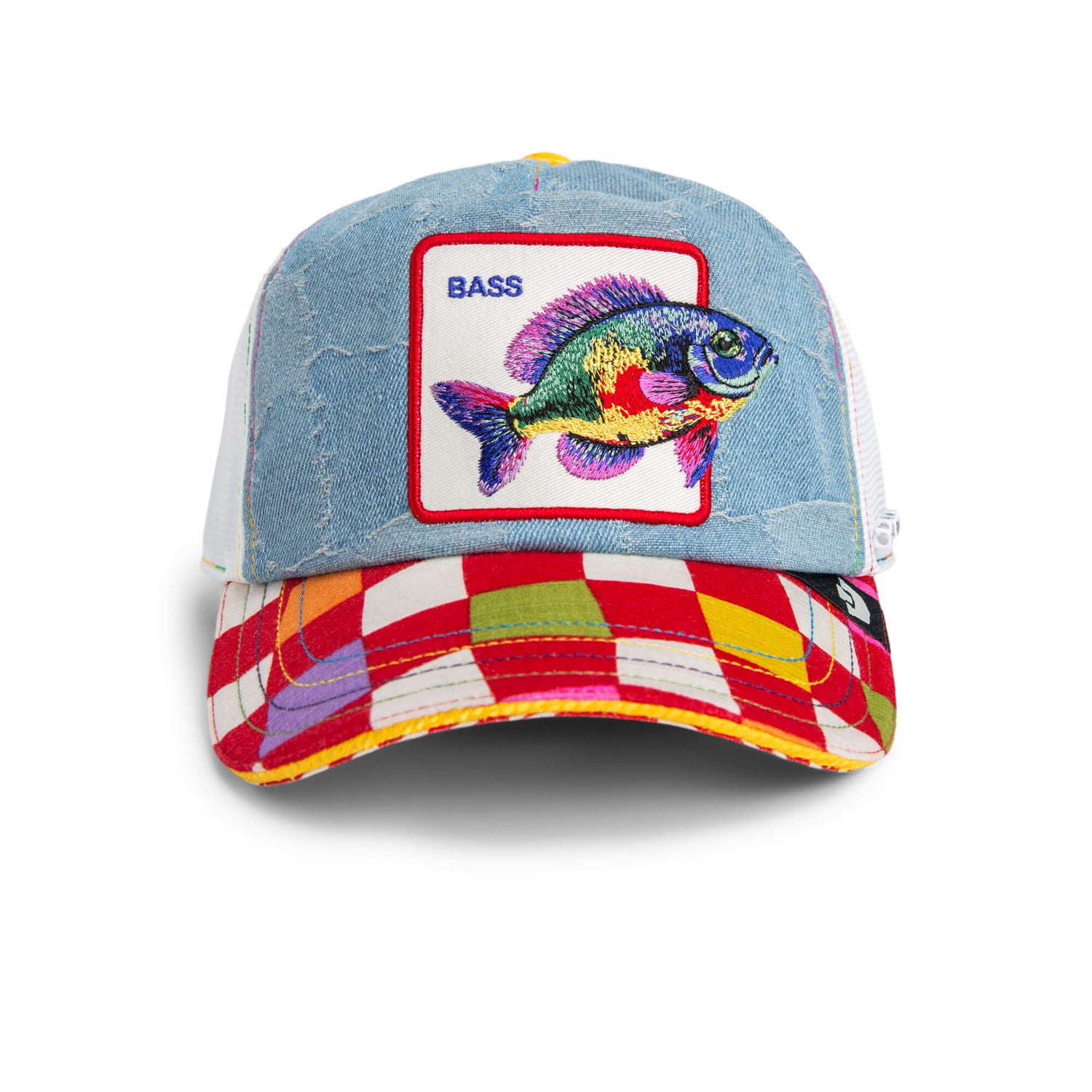 The Goorin Bros. Aquapals hat is a white mesh cap with a yellow-bordered Horse Play patch and two pink seahorses—perfect for fans of playful beach style or as a fun surf accessory.