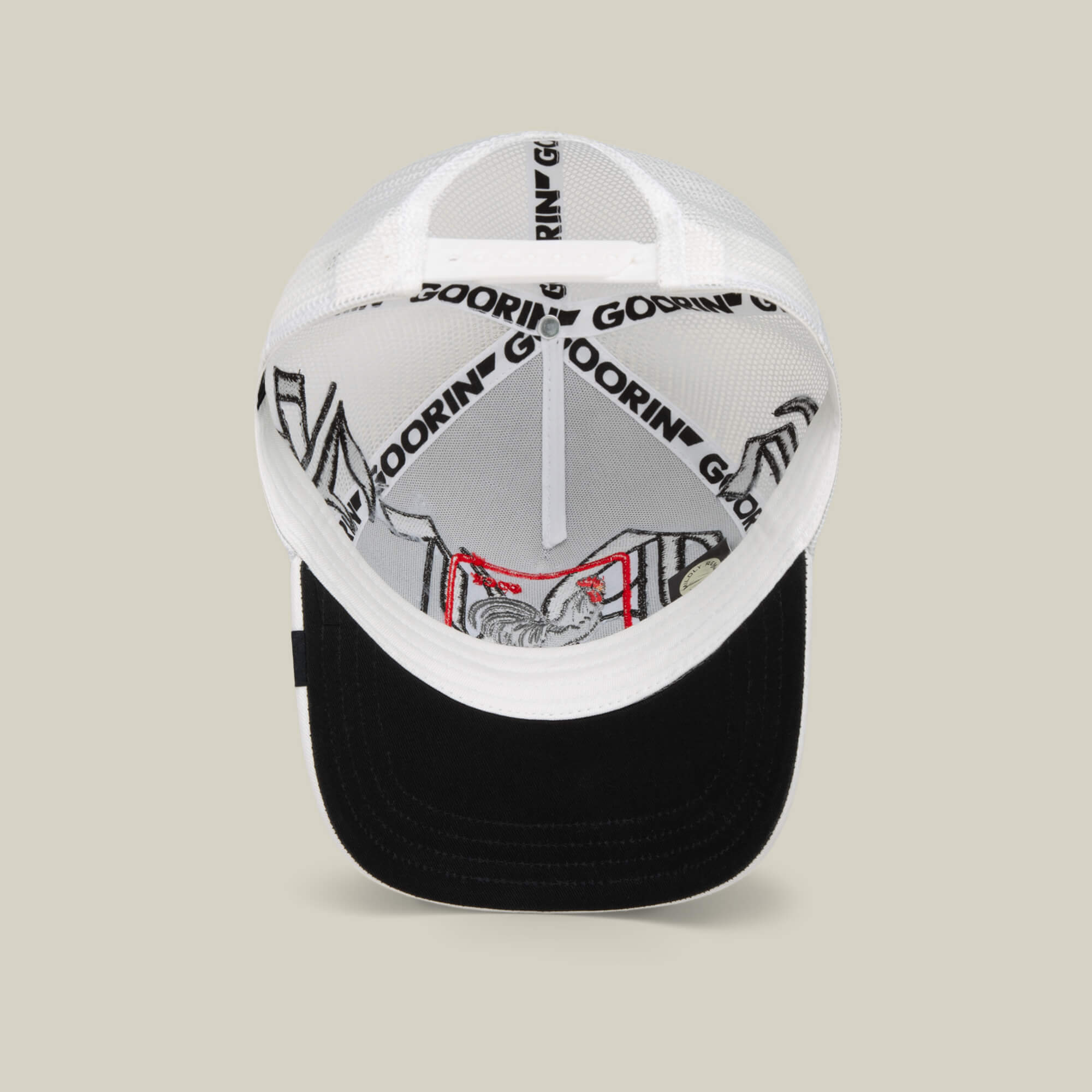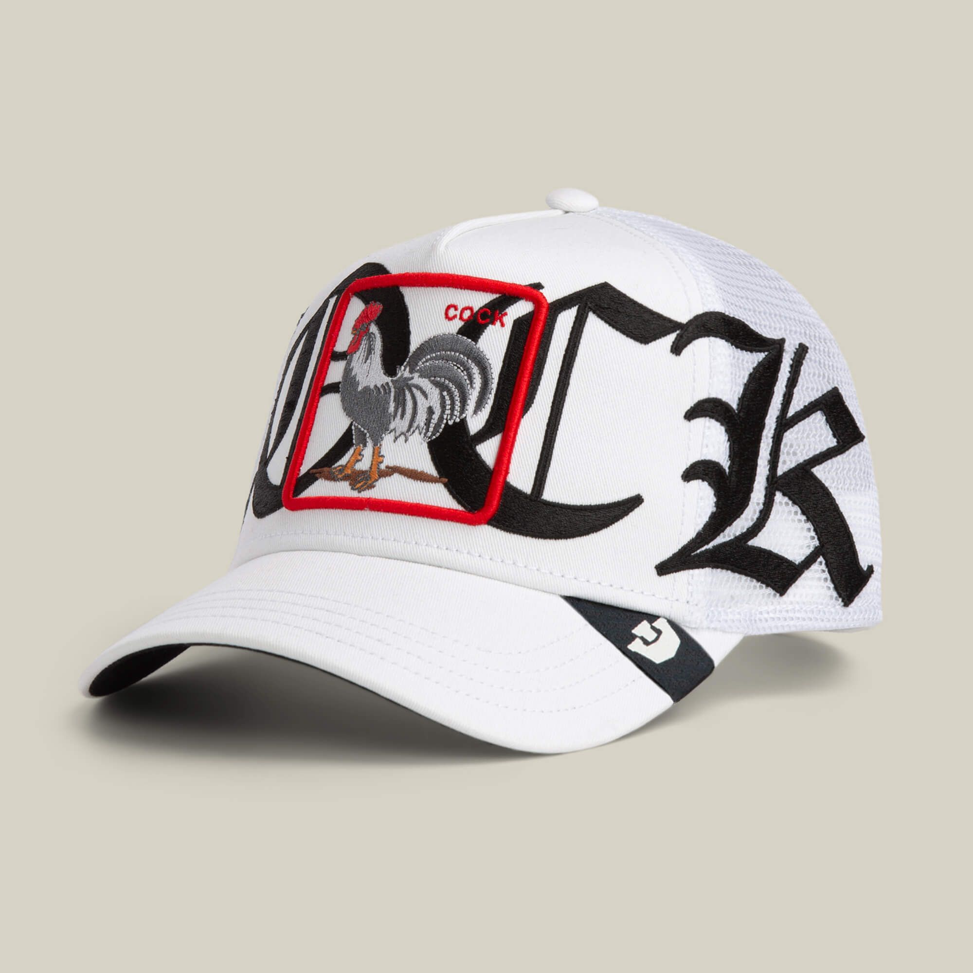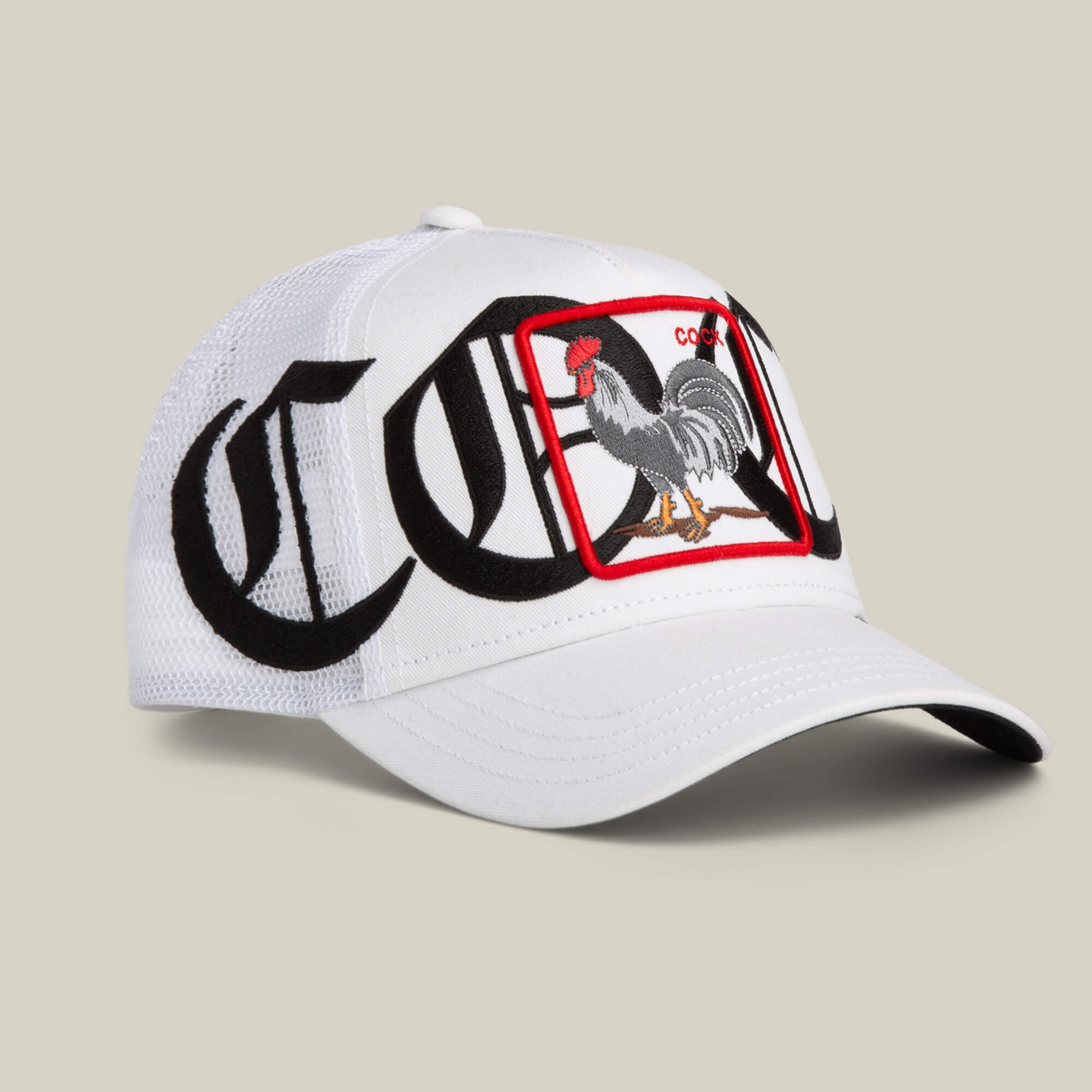 Clean white base wrapped in bold Old English script with a rooster patch front and center labeled COCK, because confidence has always crowed early. Loud look, sharp stitching, zero subtlety. White and black colorway bite, rooster patch bravado, and proof that owning the word takes the sting out of it.