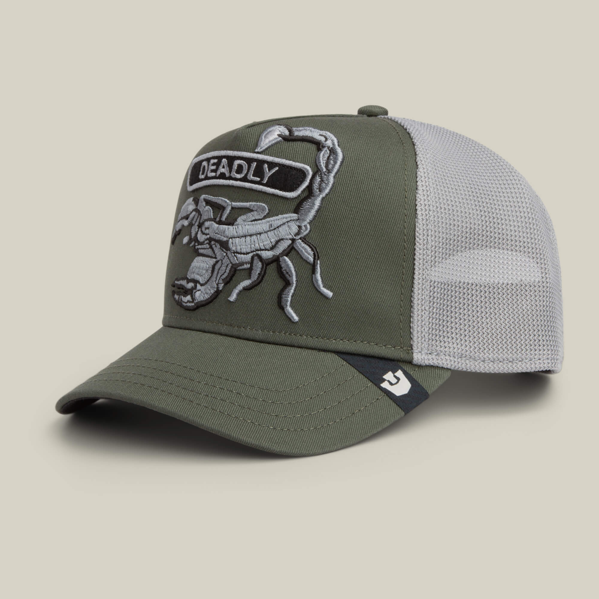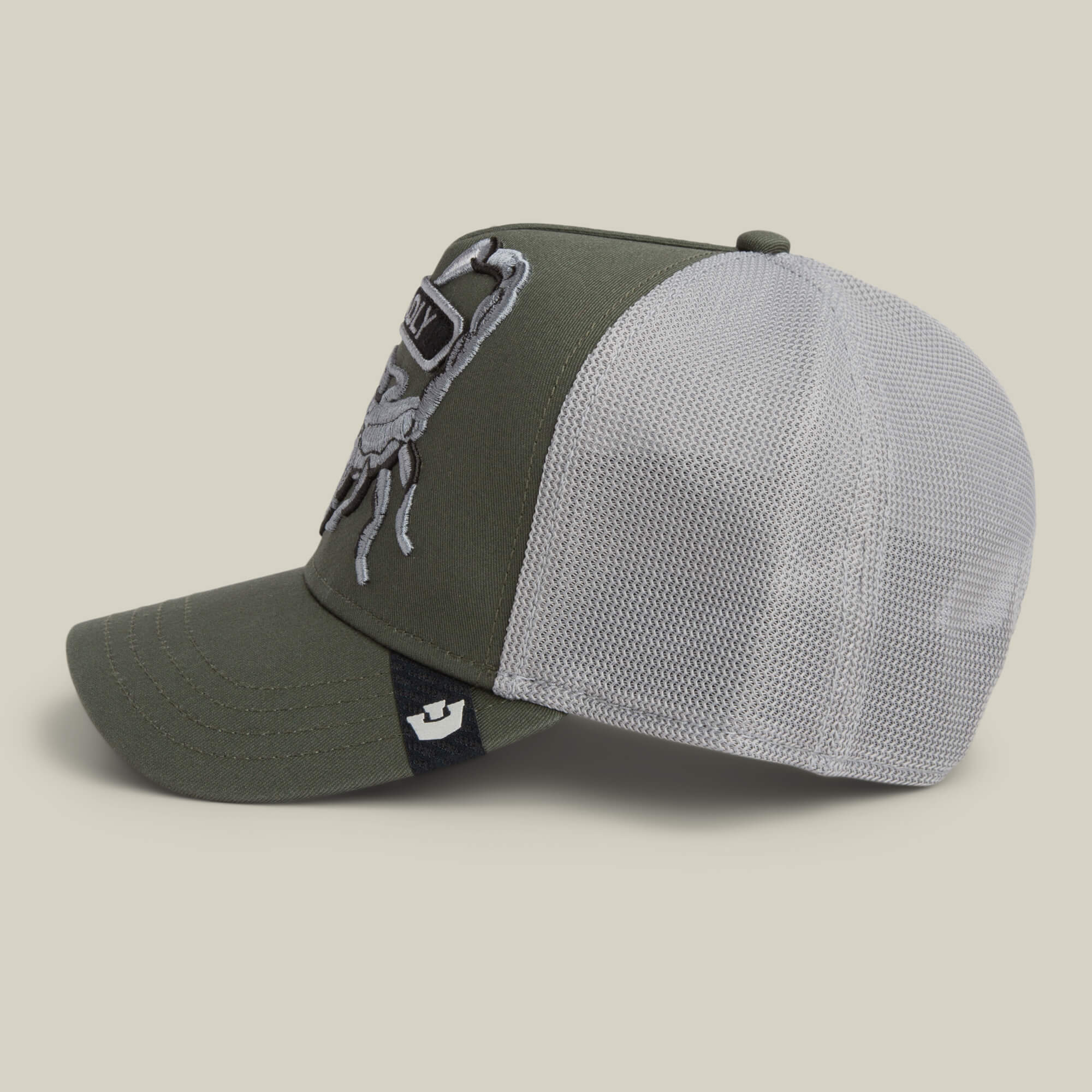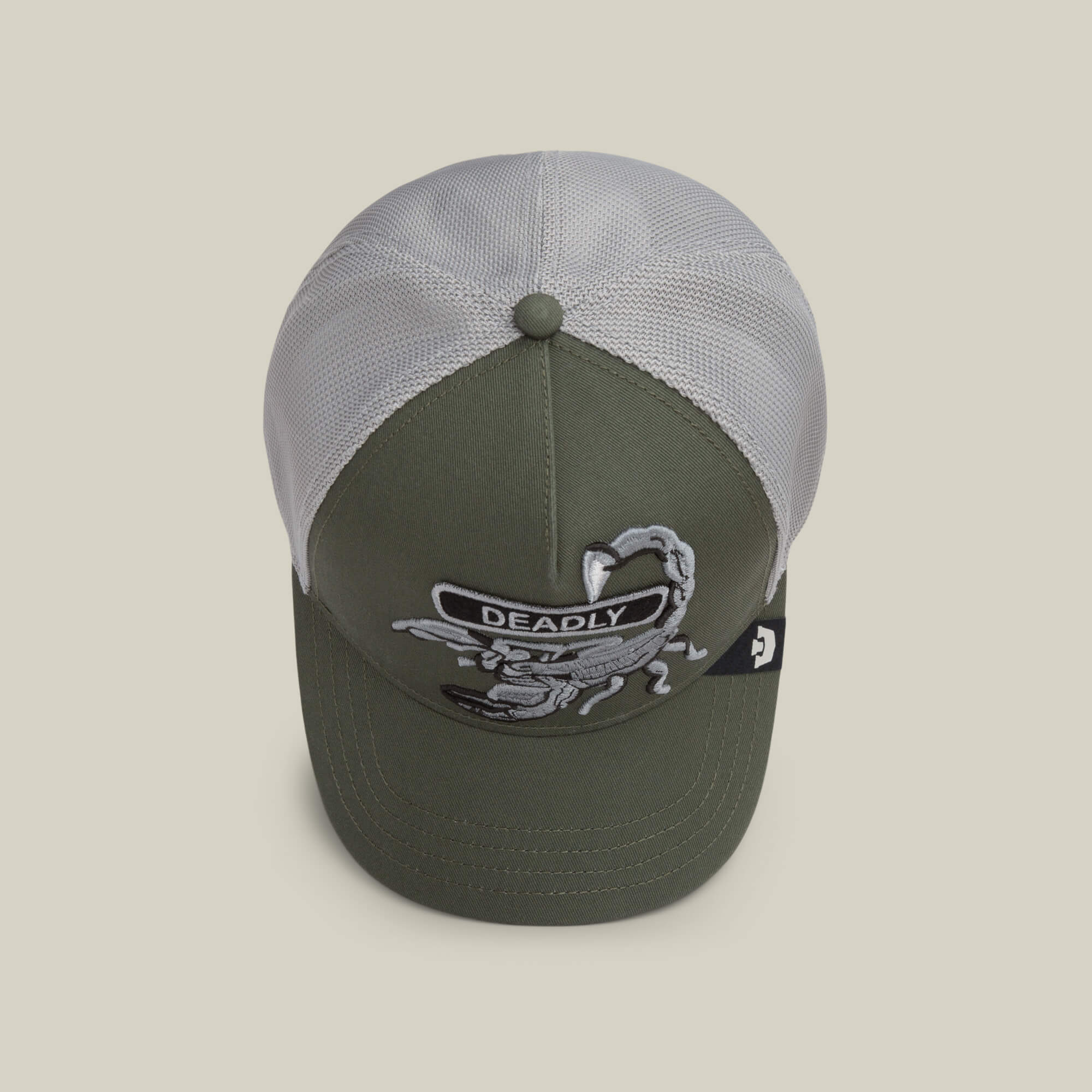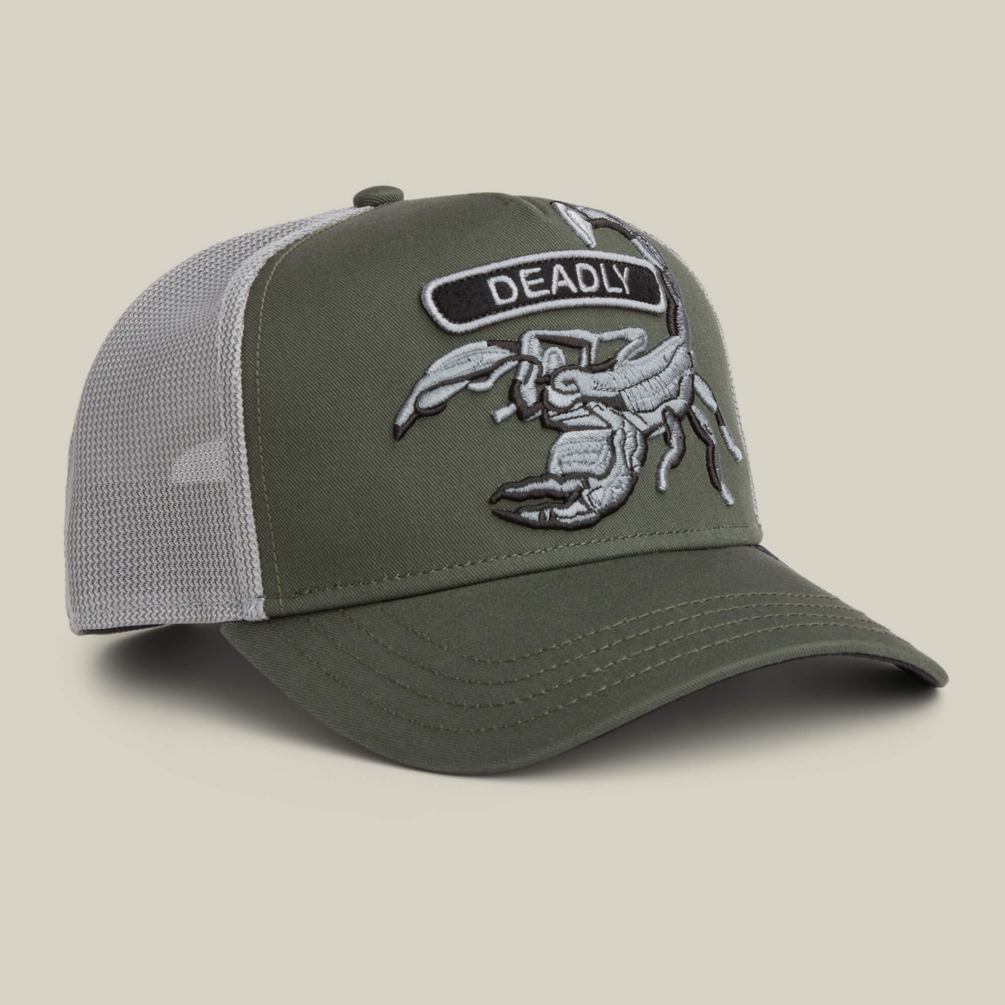 Military green with grey mesh, because subtle threats hit harder. The scorpion patch doesn’t shout, it waits, stamped Deadly for anyone paying attention or not. Calm colors, venom energy, this one handles business quietly.