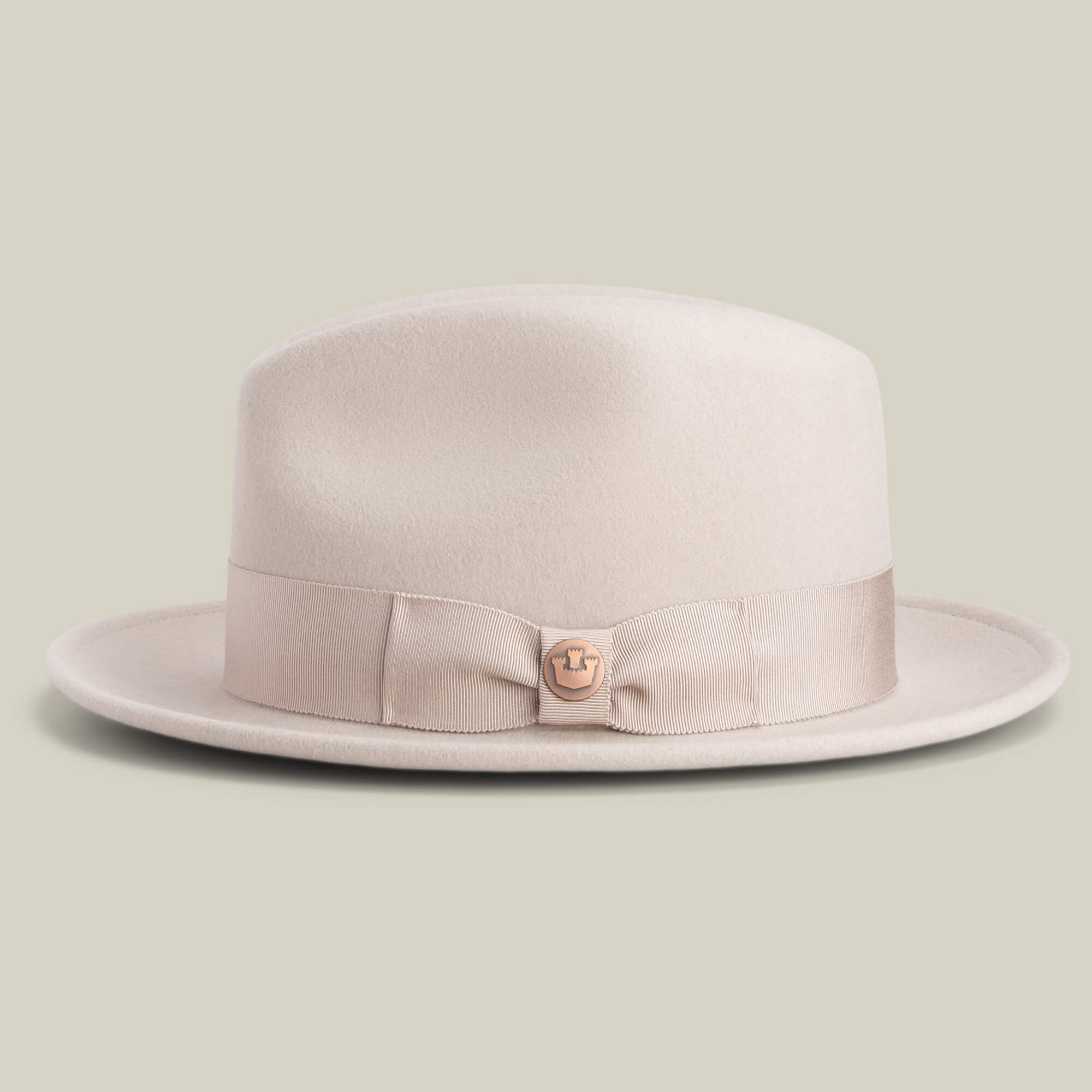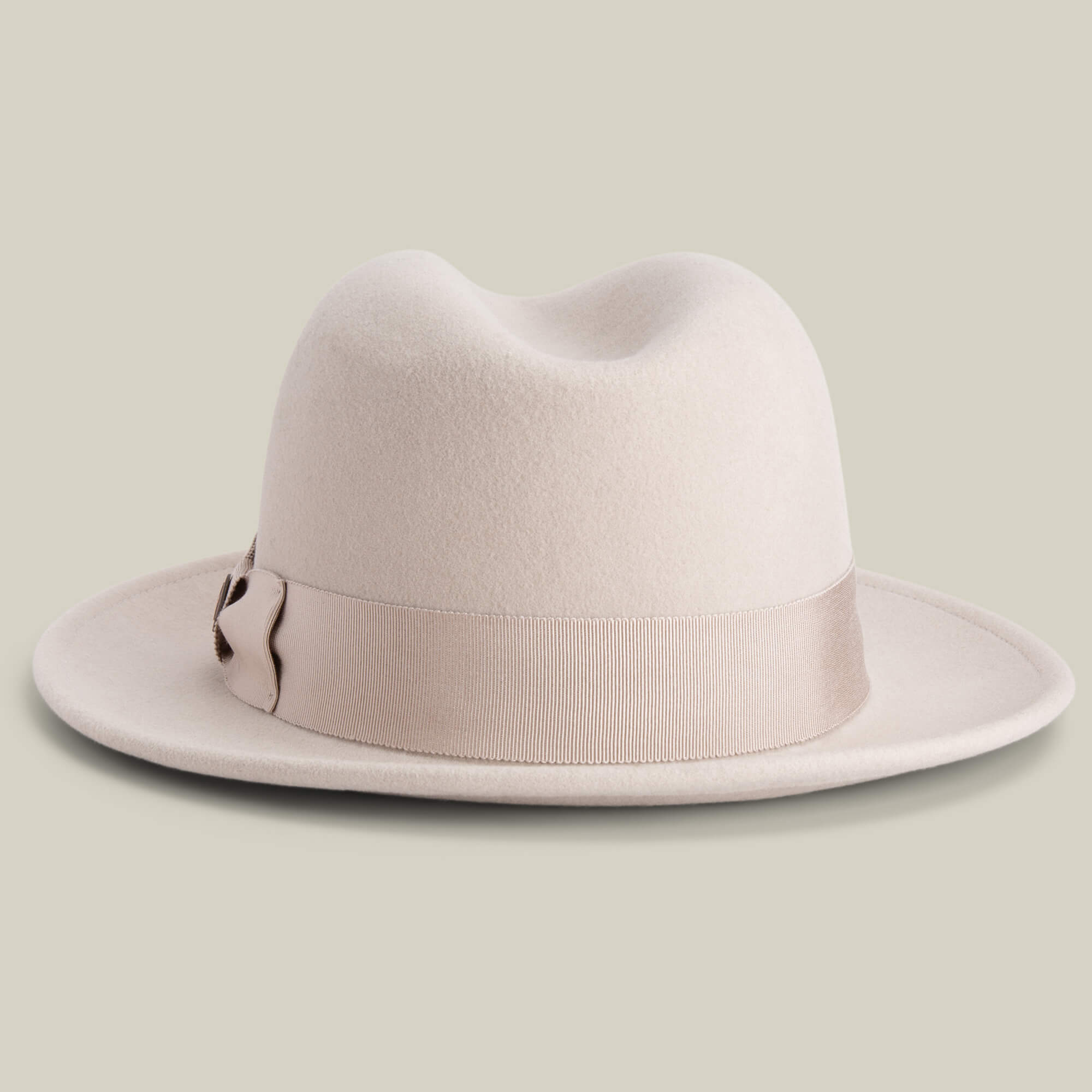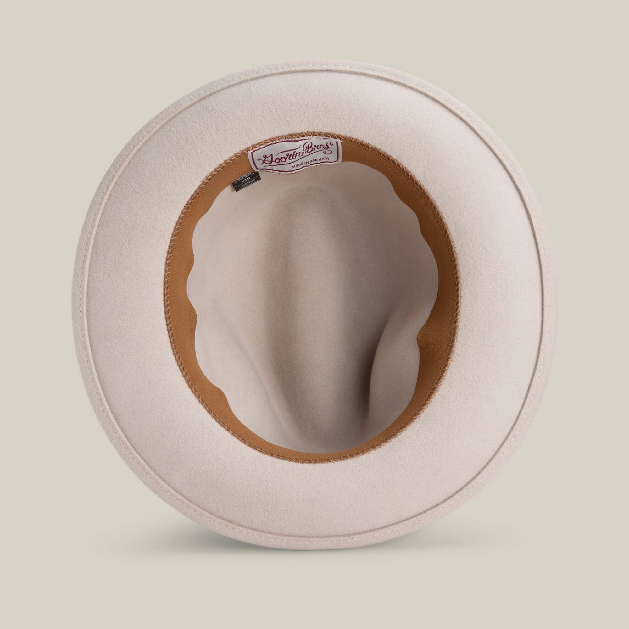 Un sombrero de fieltro hecho en Estados Unidos con seguidores de culto. Esta gorra para todas las estaciones cuenta con una corona central abollada, ala a presión, una banda de grosgrain con un lazo pellizcado y una banda para el sudor alemana.