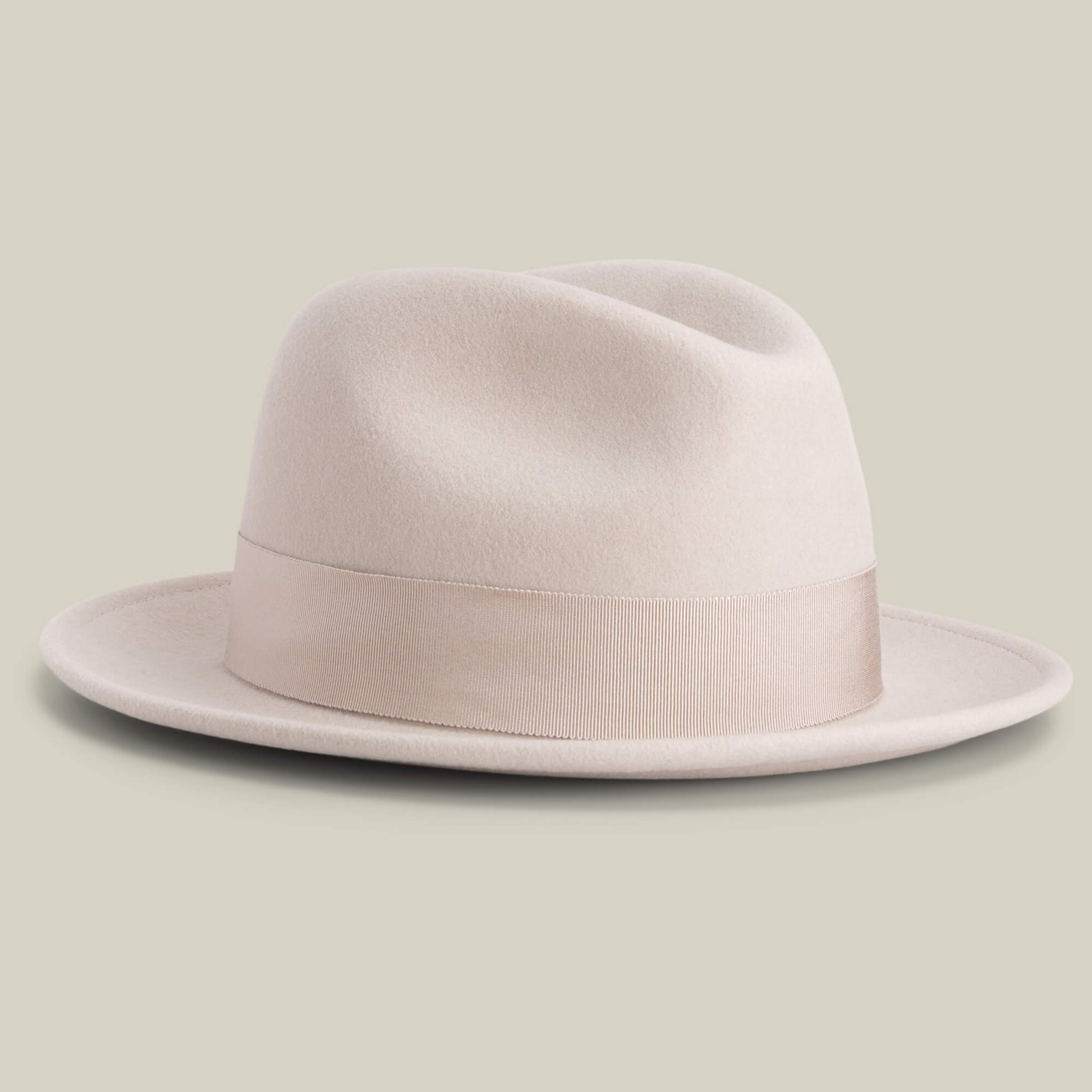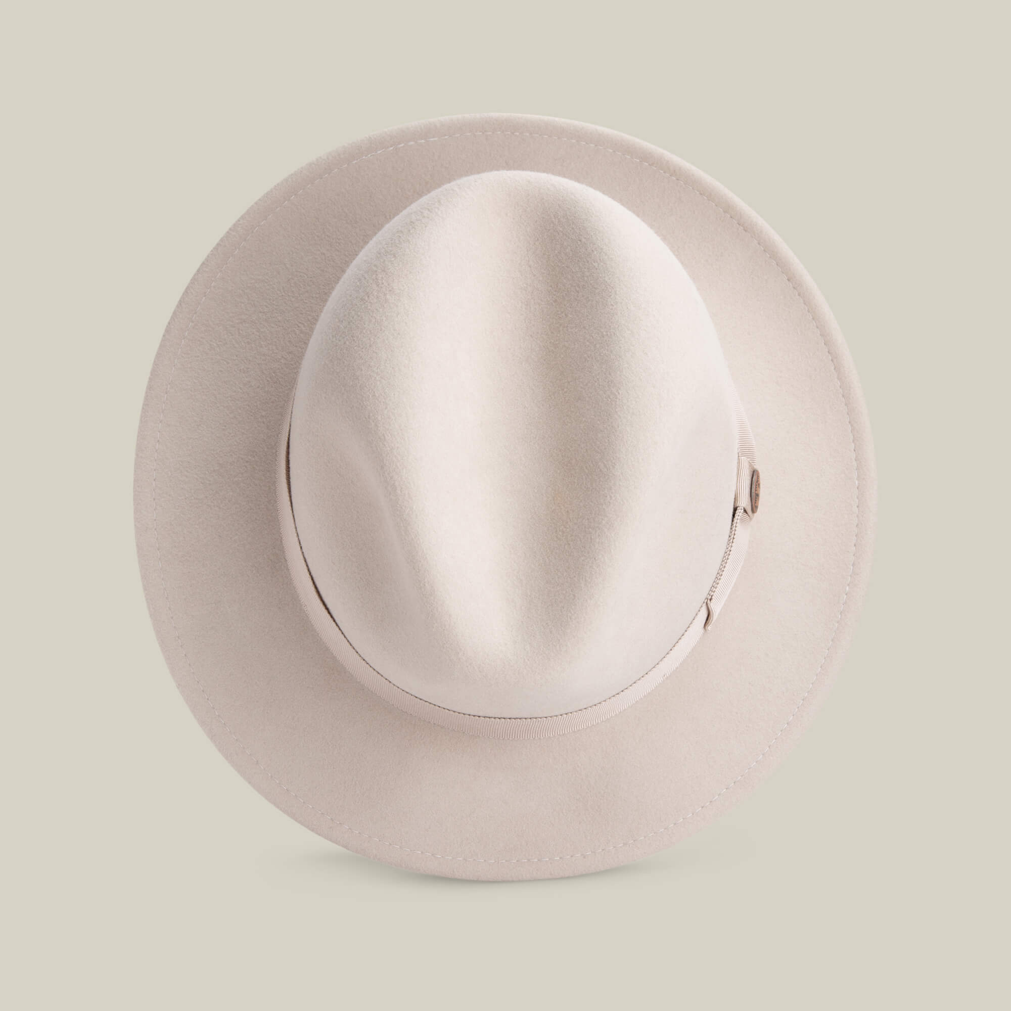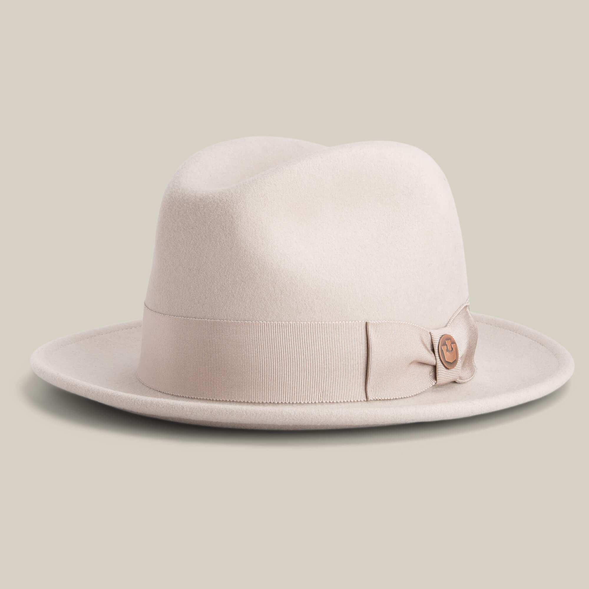 Un sombrero de fieltro hecho en Estados Unidos con seguidores de culto. Esta gorra para todas las estaciones cuenta con una corona central abollada, ala a presión, una banda de grosgrain con un lazo pellizcado y una banda para el sudor alemana.