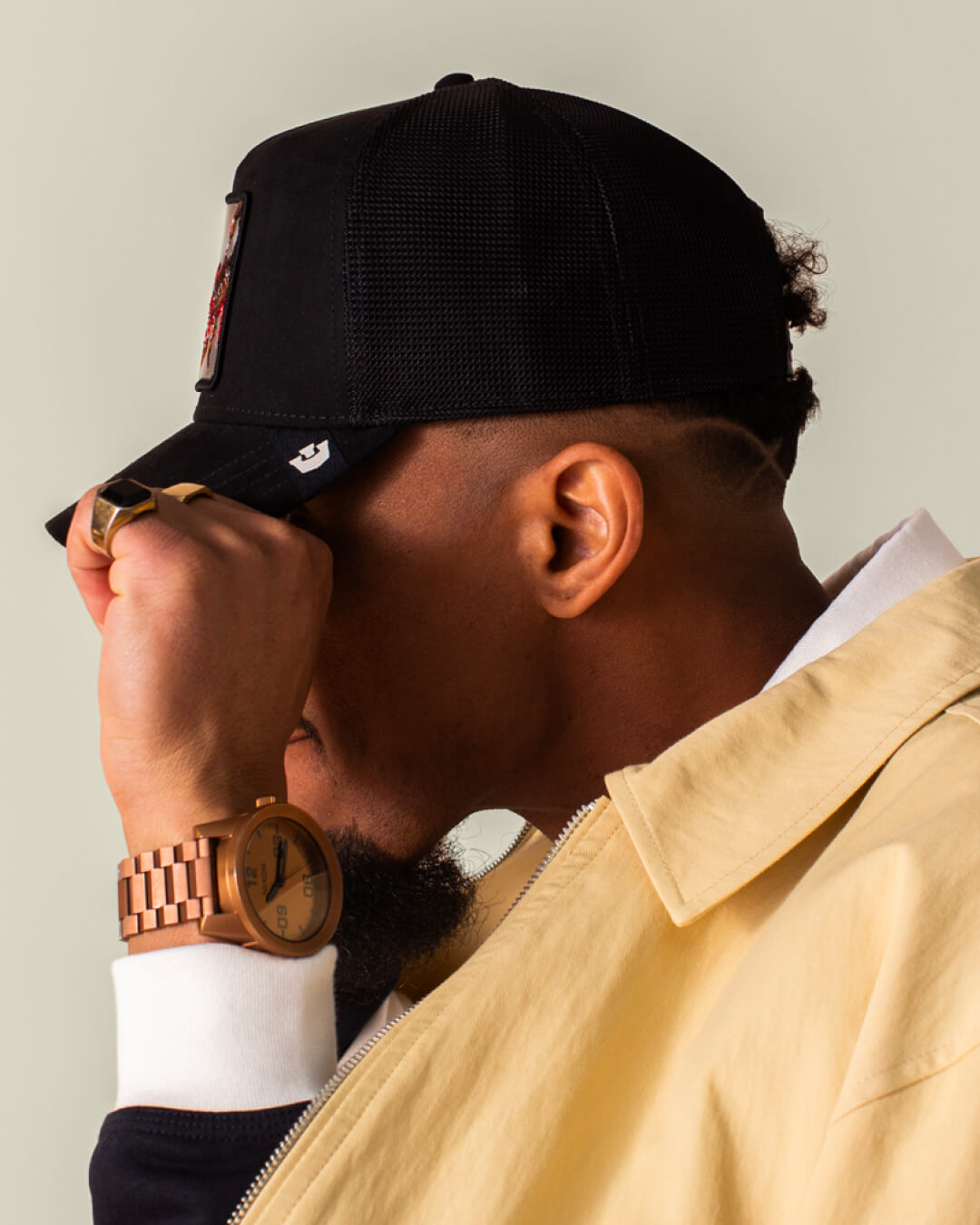 The Goorin Bros. Bold Suede Spider is a void black daddy trucker hat with a patch of an arachnid labeled DADDY and a small red mark, shown against a plain beige background.