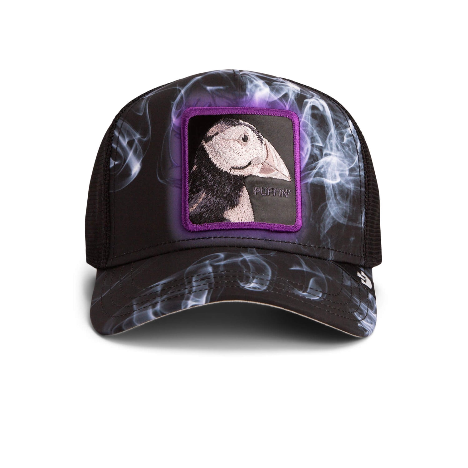 A person with a mustache and goatee wears a Goorin camo trucker hat, quilted vest, and cream shirt, looking over their shoulder at the camera against a plain background.