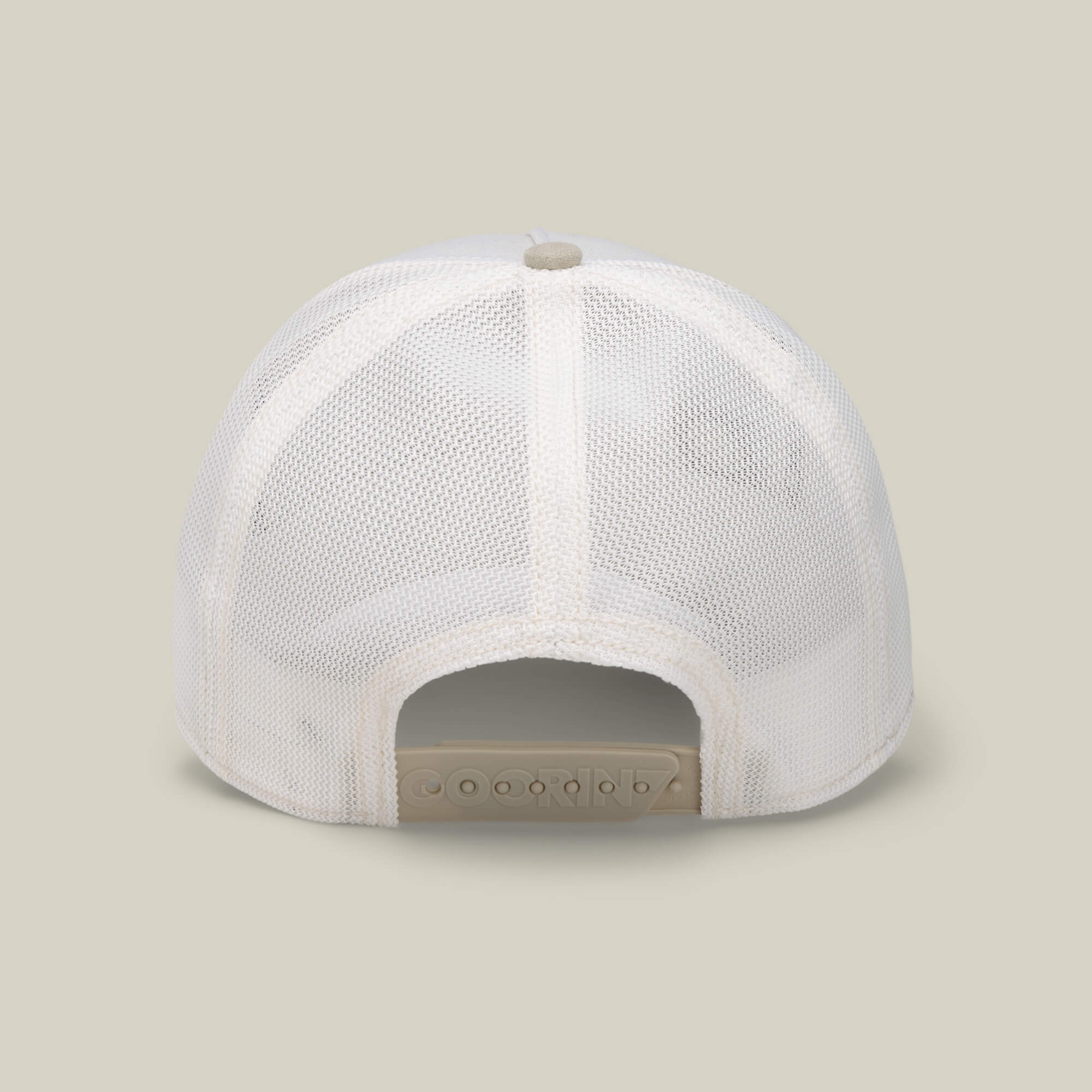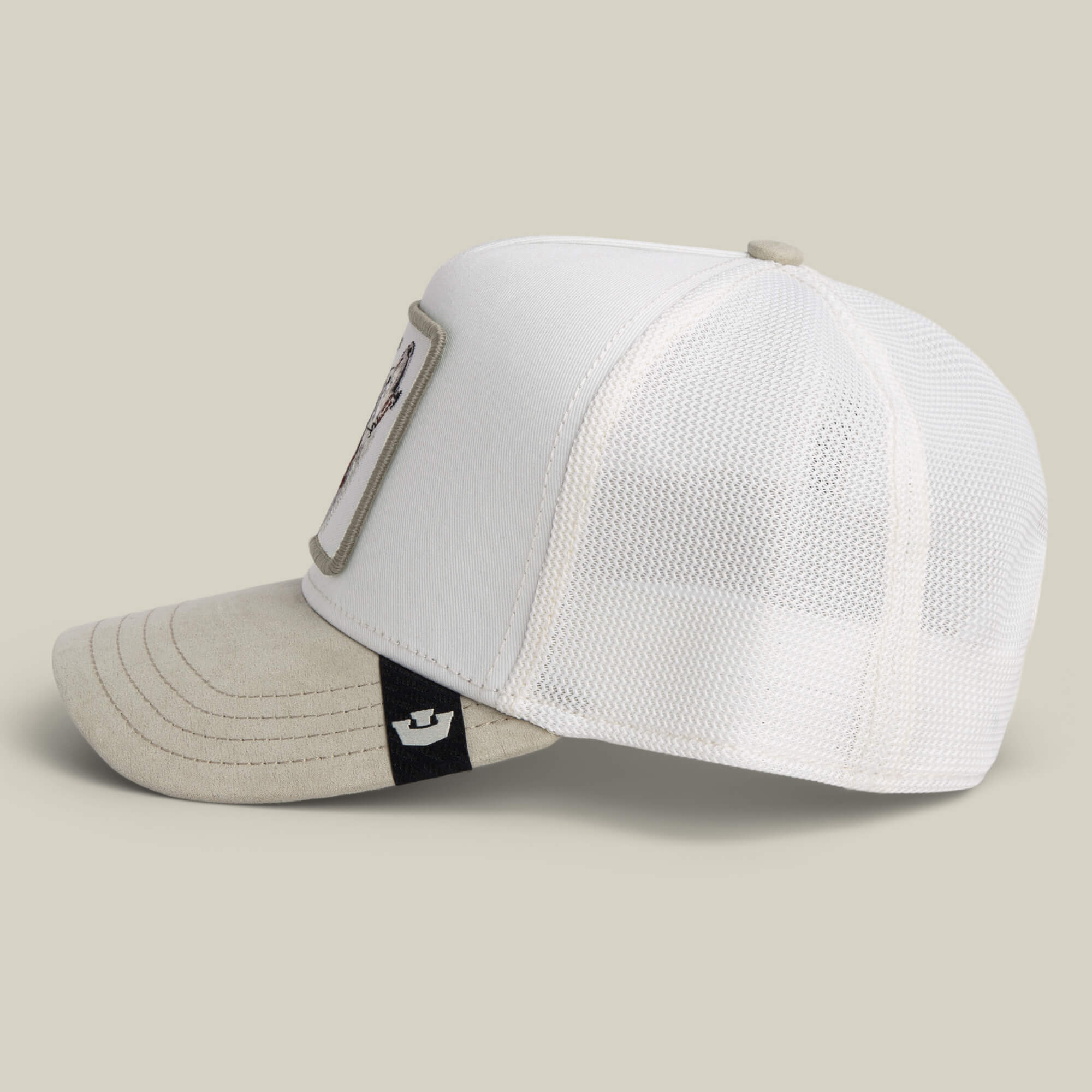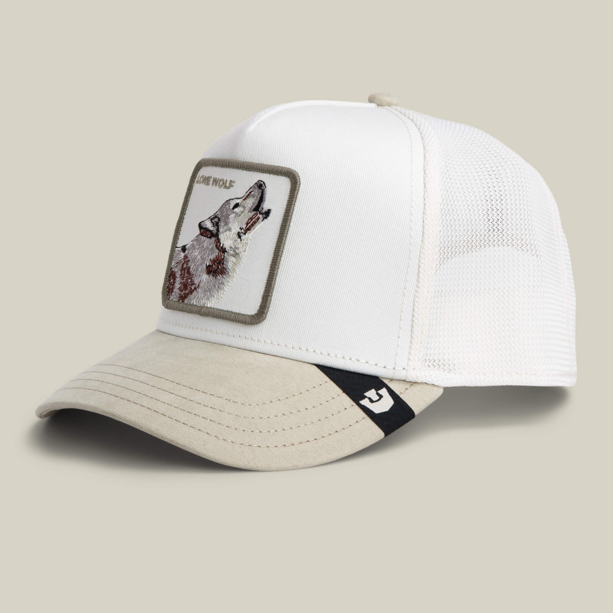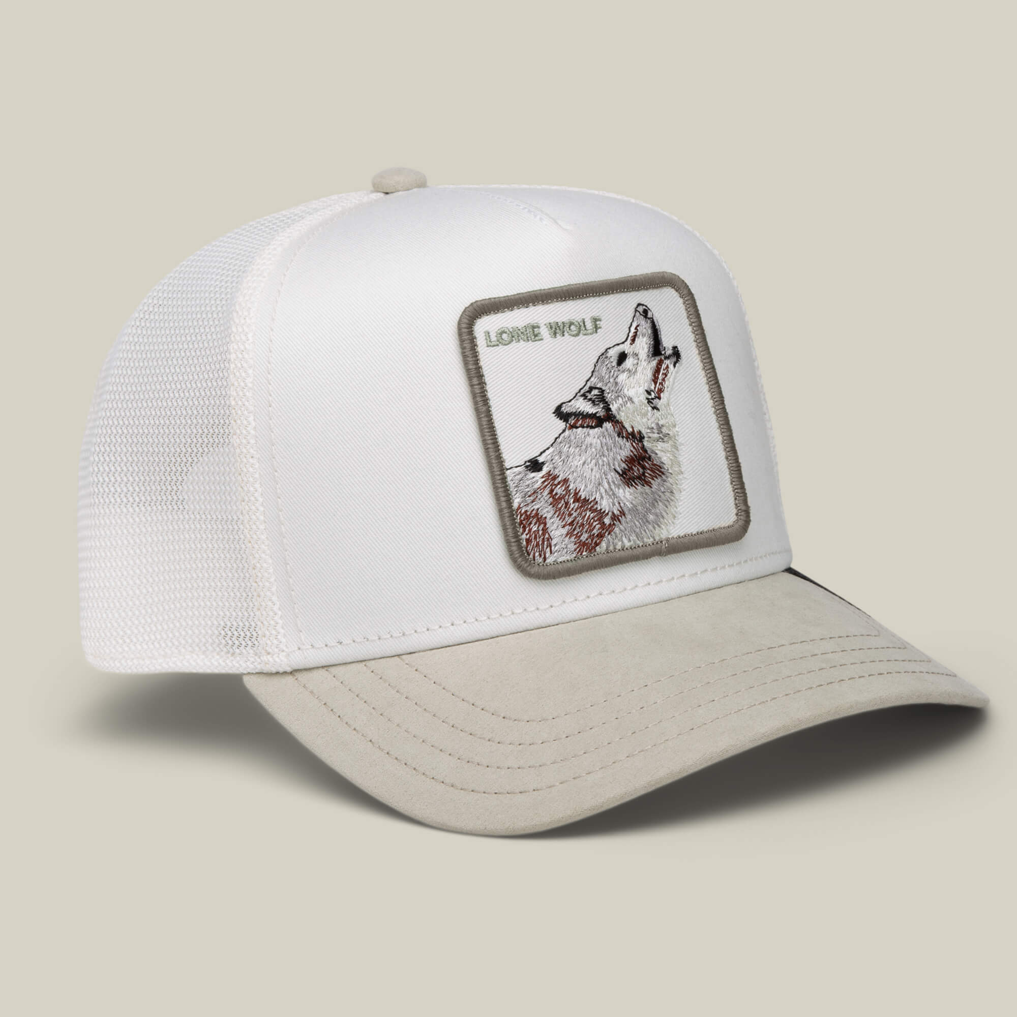 Crisp white crown with a soft sand suede brim and a wolf patch that proudly claims LONE WOLF. Quiet howl, steady stare, no pack required. White and beige colorway restraint, wolf patch independence, and confidence that doesn’t need company.