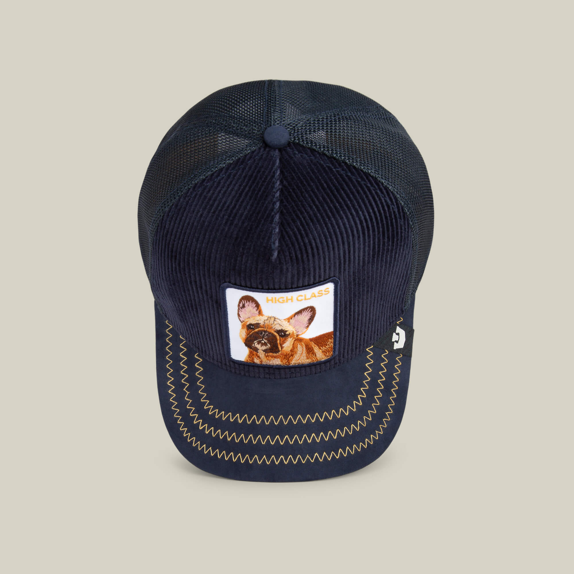High Class Remix rolls deep in navy-on-navy textures with golden stitching so rich it should come with a tax bracket. The Frenchie patch brings just the right amount of “you can’t sit with us” energy—equal parts sass, status, and subtle shade.