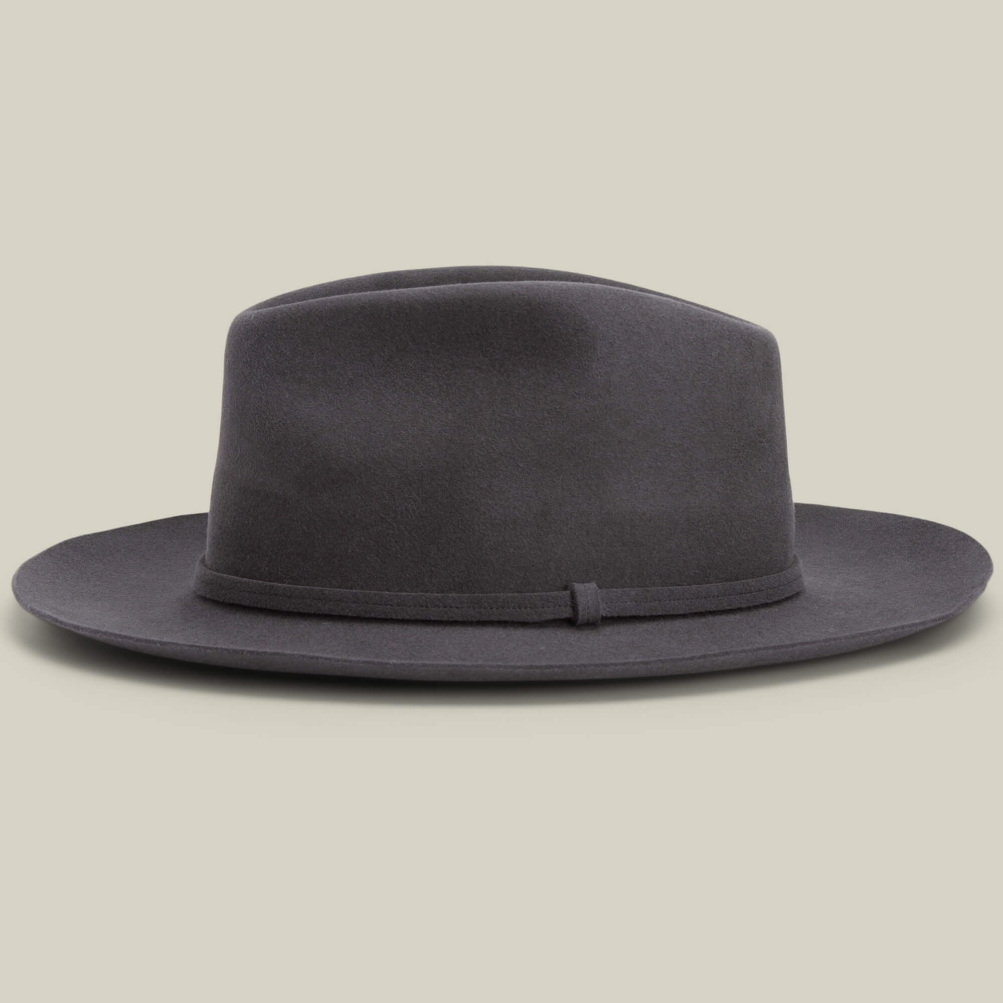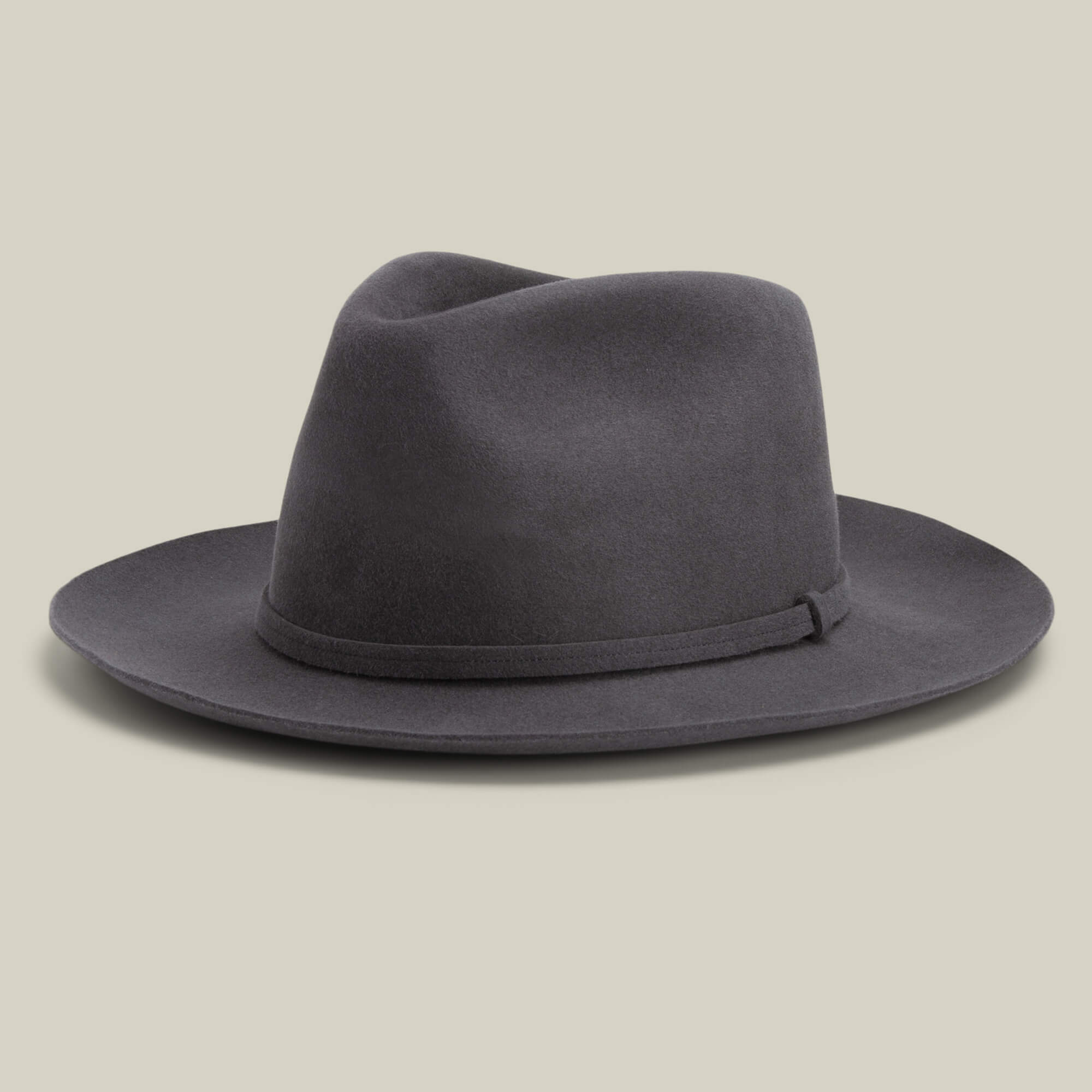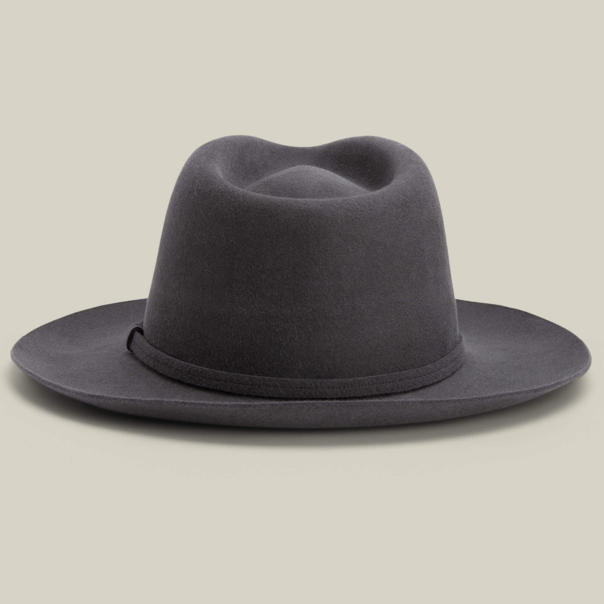 Night Hawk is a shallow depth teardrop crown fedora built on [BLOCK No.18] with a wide snap brim, medium stiffness, and a smooth finish. This all season hat features a teardrop crown, 2 3/4" raw edge snap brim, a self-felt hat band with a genuine leather sweatband.