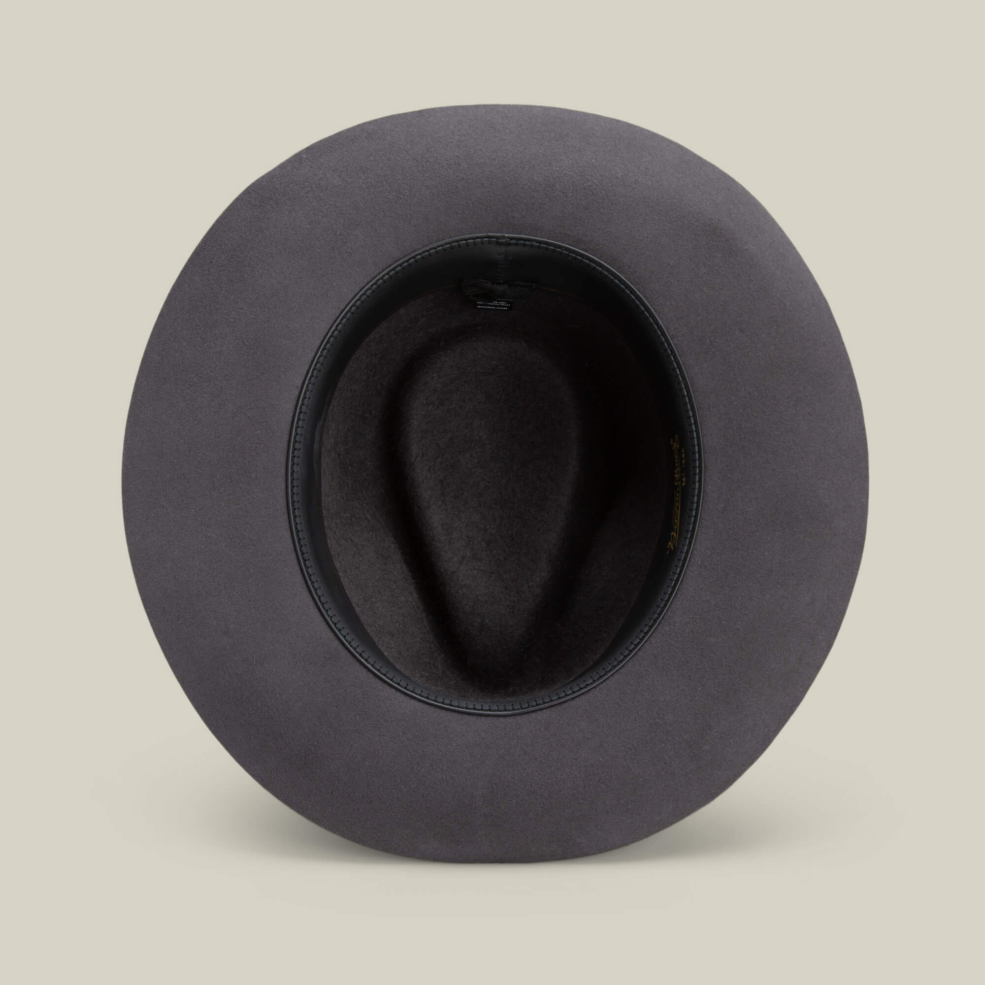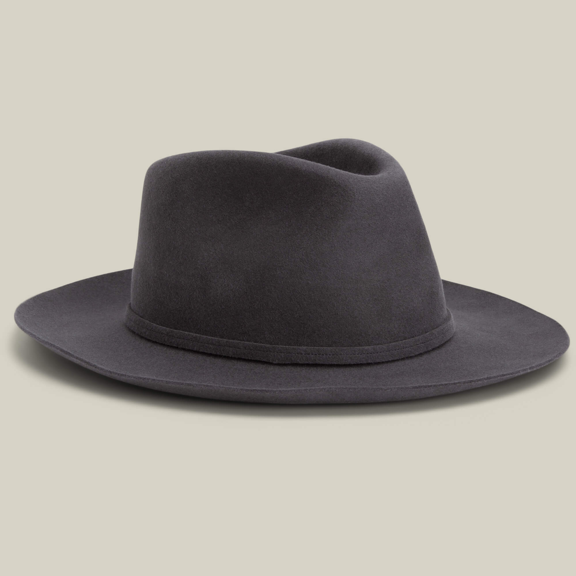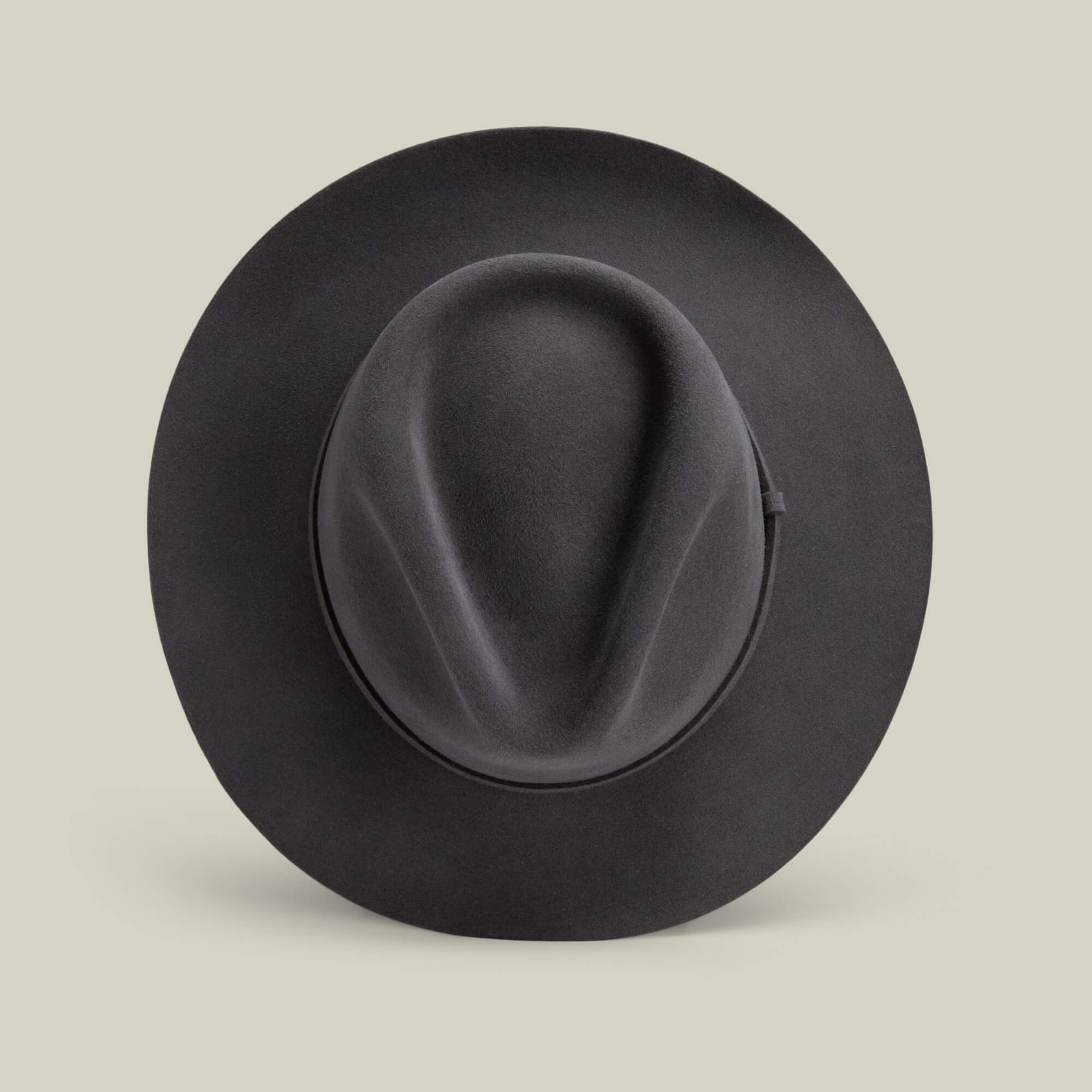 Night Hawk is a shallow depth teardrop crown fedora built on [BLOCK No.18] with a wide snap brim, medium stiffness, and a smooth finish. This all season hat features a teardrop crown, 2 3/4" raw edge snap brim, a self-felt hat band with a genuine leather sweatband.