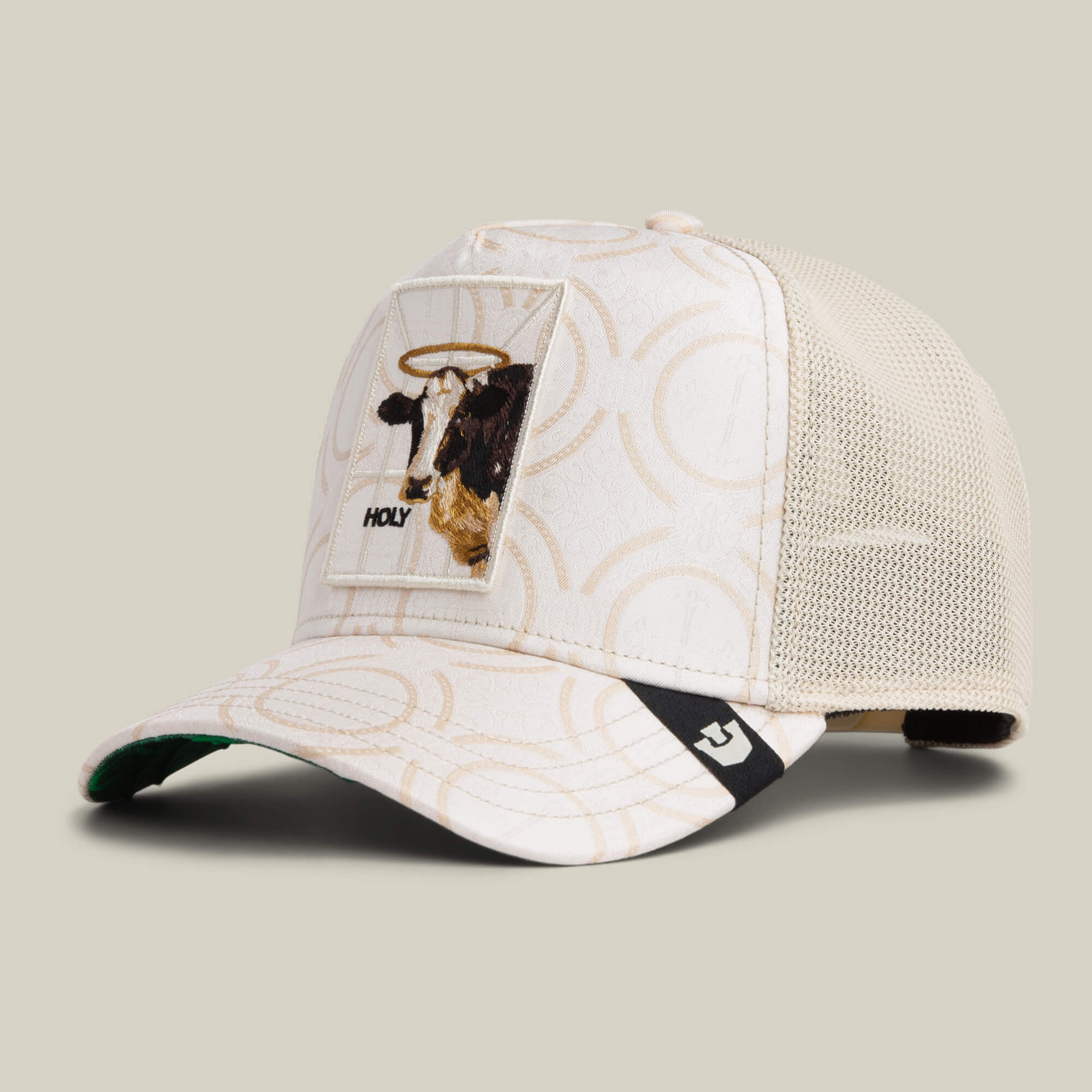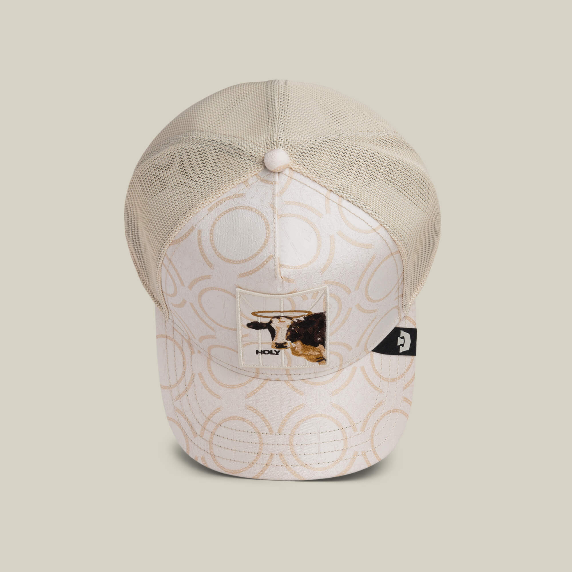 Cream and off-white tones keep it clean while the haloed cow patch labeled HOLY quietly judges your life choices. The patterned crown adds just enough texture to remind you this isn’t farm wear, it’s faith with a sense of humor. Sacred cow, holy attitude, and zero interest in blending in.