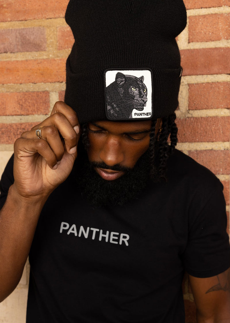 The Menace Beanie by Goorin Bros. in DESIRE features a black panther face patch with yellow eyes on the front fold, plus a small black tag.