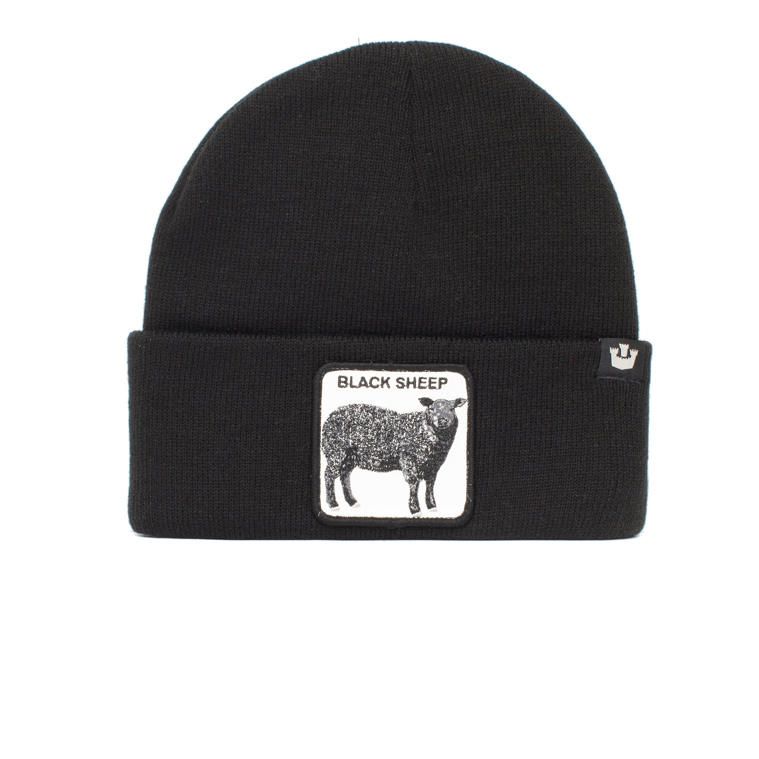 Stay warm in The Him Beanie by Goorin Bros.—a BISCUIT-colored knit with a cuff, bold goat patch, and "HIM" text on the front, plus a black tag with a white logo on the right side.